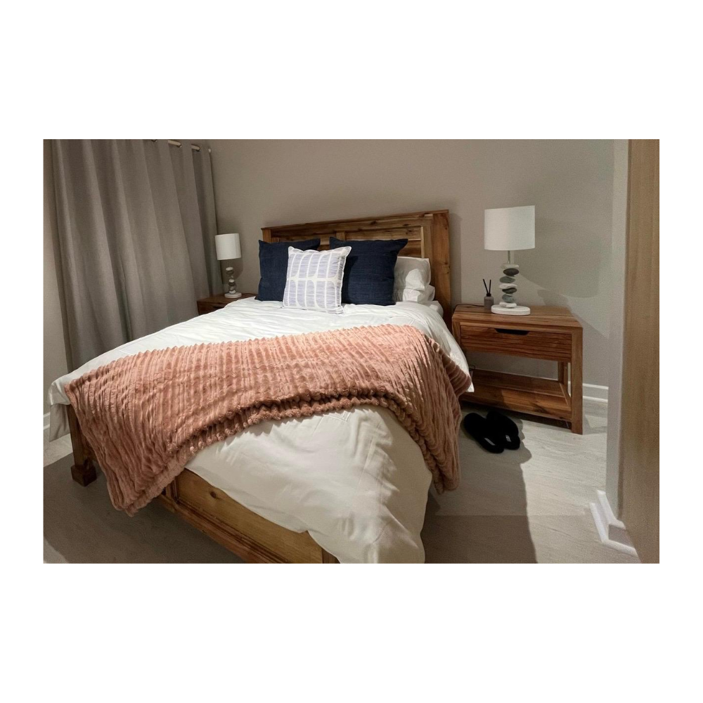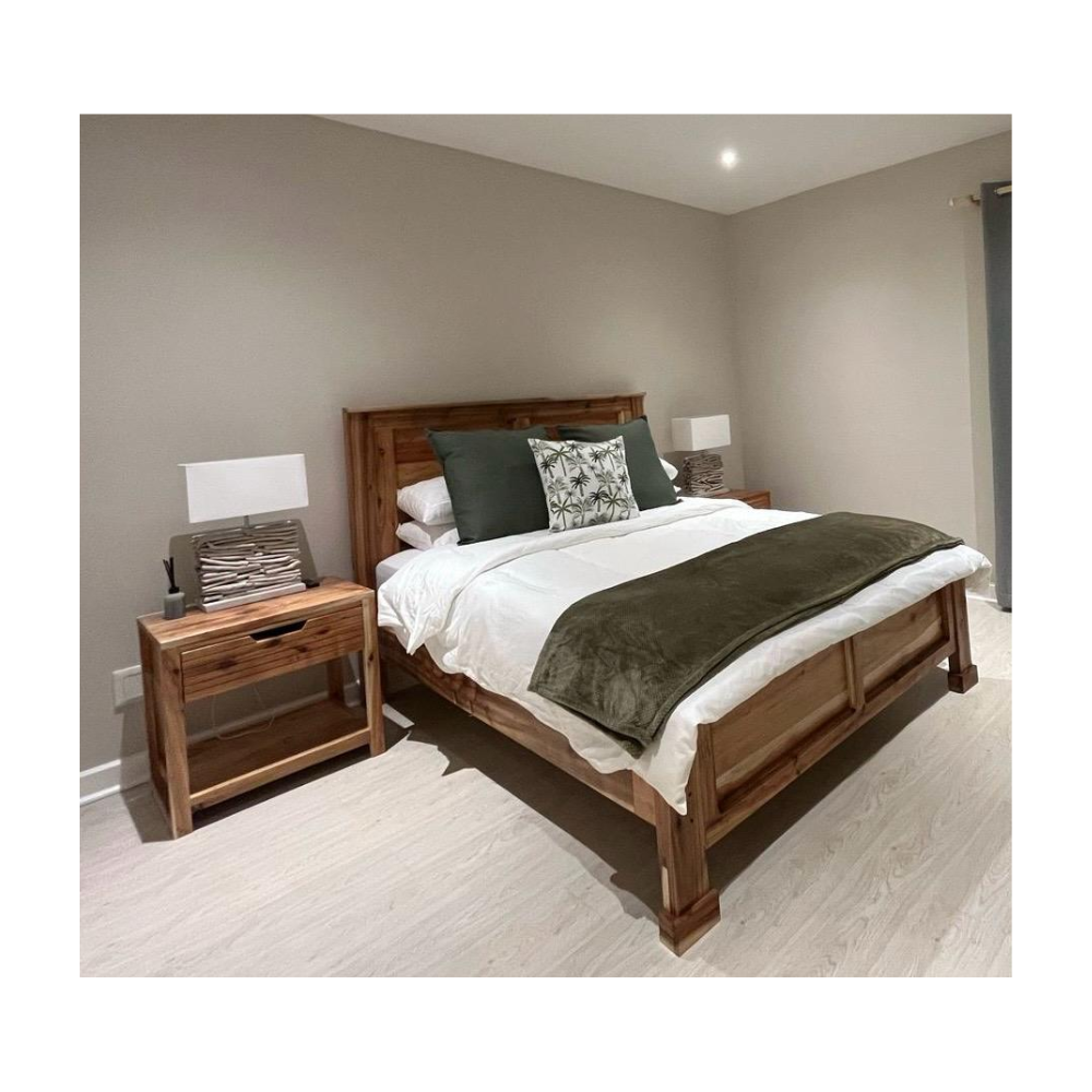 Queen size solid acacia( can be manufactured in Pinewood contact for pricing) bed with slats base and high headboard and detailed foot piece