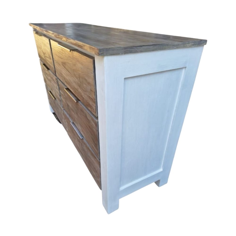 Pine Wood with white paint finishing with a grey & brown stain wash, ball bearing runners & silver concealed handles